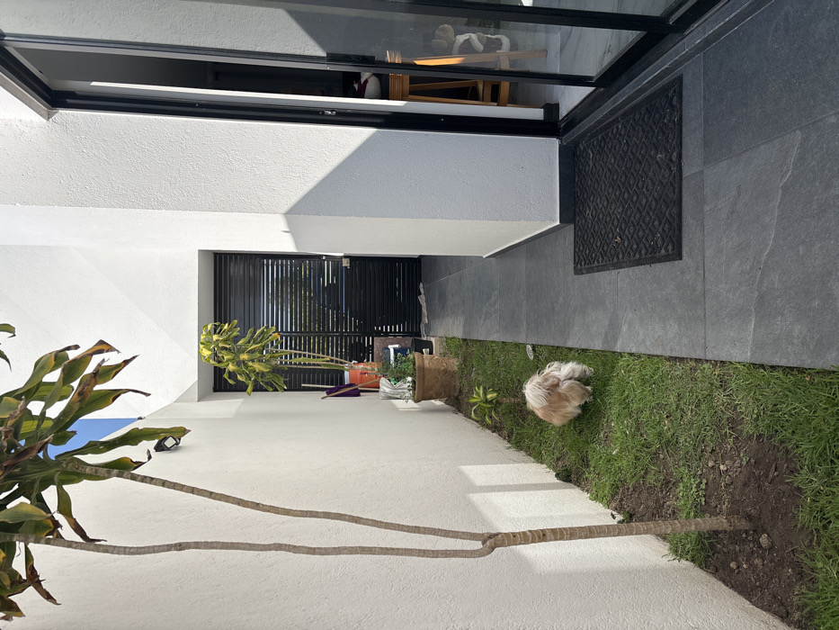 A modern home's exterior is captured from an unusual perspective. The crisp white walls are juxtaposed with dark gray tiles and a lush green lawn. A small, fluffy dog rests on the grass. A dark door is visible between the walls, with plants and an orange box placed on the white concrete. The perspective is from above, looking downwards along the side of the house.