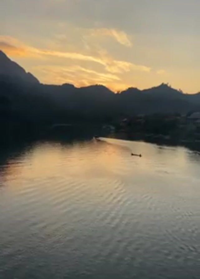 wide river with mountains in the background, during a sunset. The sky is a mix of orange and grey. The mountains are dark. The river reflects the colors of the sky. There are two boats in the river. The water has small ripples on the surface. There is a building near the water on the right side of the frame. The camera appears to be stationary.
