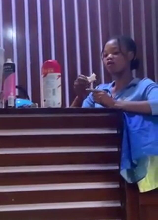 young woman of color in a room with striped wall paneling. She is wearing a blue long-sleeved shirt and standing next to a dark wooden dresser or headboard. On top of the dresser, there are several items including a can of hairspray, a bottle with a red lid and Chinese writing, and what appears to be an iron. The woman is eating something white and small, possibly a snack. In the lower left corner of the frame is an air conditioning unit. There is music playing in the background.