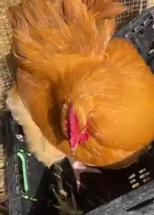 brown chicken in an enclosure. The chicken is standing in a black plastic crate. The enclosure has a wire mesh top and sides. There is hay on the floor of the enclosure. In the background, there is a wire cage with a bowl of food inside. The camera moves around the chicken.