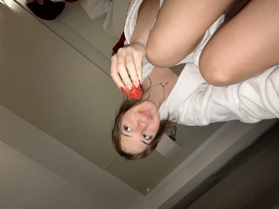 A woman in a white robe holds a large strawberry near her face. The image is a low-angle shot, slightly tilted, with a mirror in the background reflecting part of a bed and a lamp. The woman has light brown hair, fair skin, and is wearing a delicate necklace with cross charms. Her nails are painted with a strawberry pattern. The lighting is soft, casting a warm glow. The overall impression is casual and intimate.