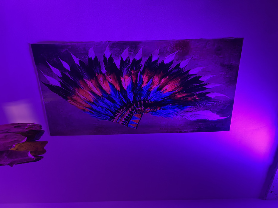 The scene displays an interior space located in Yerevan, Armenia, entirely illuminated by a pervasive purple light. A rectangular canvas painting is mounted vertically on a plain wall, occupying the right side of the frame. The artwork depicts a large, stylized Native American-style headdress or war bonnet, featuring numerous vibrant blue, pink, red, and white feathers, set against a dark, textured background. The headdress band shows distinct geometric patterning. In the upper left quadrant, a segment of a hanging decorative fixture, possibly a lamp, is visible, composed of layered, irregular elements that exhibit a warm, golden hue. A faint pinkish light reflection is present on an unseen surface in the lower-left corner. No individuals are present; no actions or interactions are depicted.