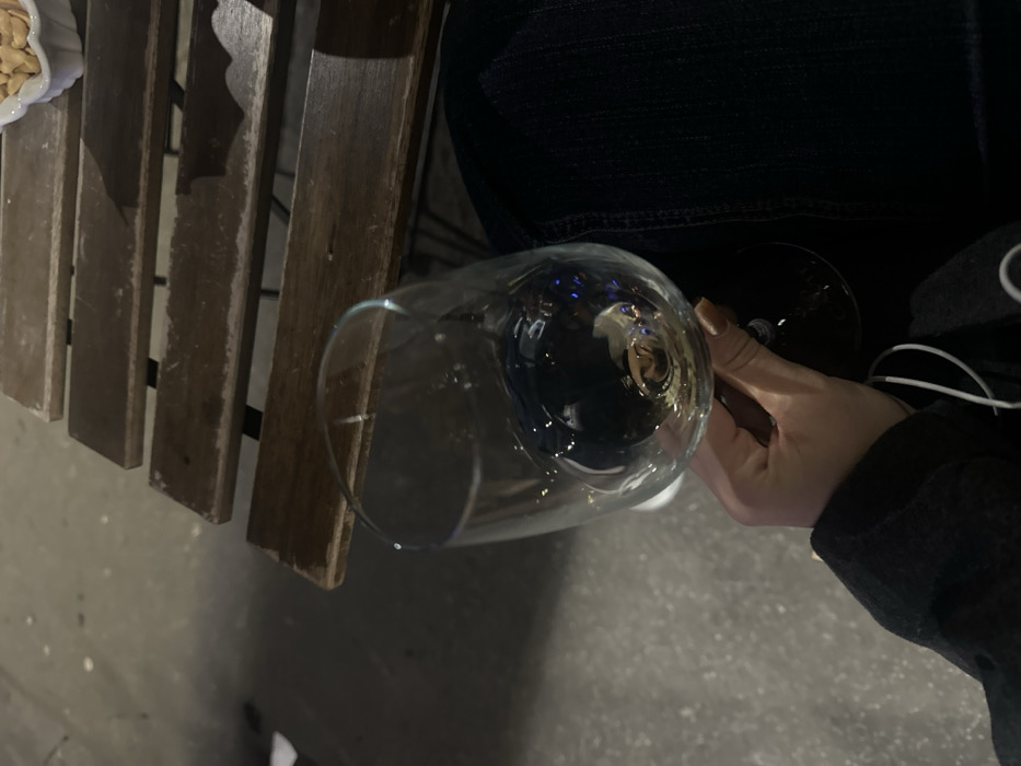 A top-down shot shows a wine glass nearly full with red wine held by a hand. The glass sits atop a wooden-slatted surface, likely a table or bench. Next to the glass is a person wearing jeans and a dark jacket. In the top left corner, a partial view of a white bowl containing snacks is visible. The background features a neutral-toned surface, possibly concrete.