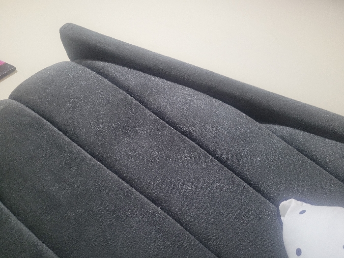 The scene depicts a close-up, angled view of a dark grey upholstered surface, located within the city of Nanyuki, Kenya