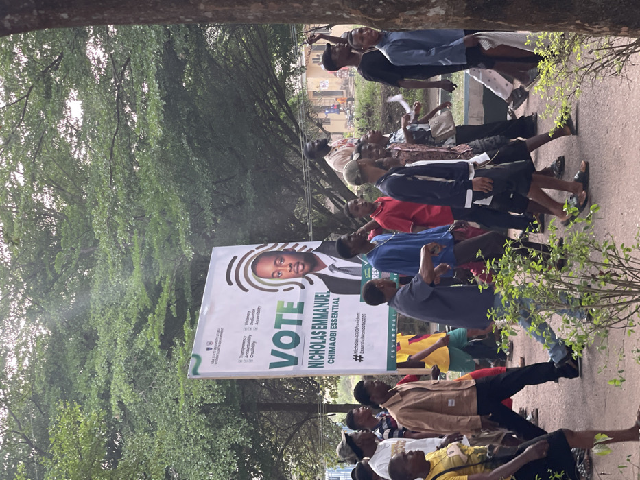 A group of young people is gathered near a campaign poster for Nicholas Emmanuel Chimaobi, who is running for SUG President