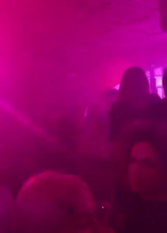 group of people in what appears to be a club or bar, illuminated by a strong purple light. The room seems crowded and smoky, obscuring details of people and objects in the background. Several individuals are visible, mostly in dark clothing. One woman in the foreground has blonde hair and a hairclip, another appears to be holding a drink. A hand can be seen raised in the air. The ceiling is visible with a grid-like design and some hanging decorations. The overall atmosphere seems lively, but details are difficult to discern due to the lighting and smoke.