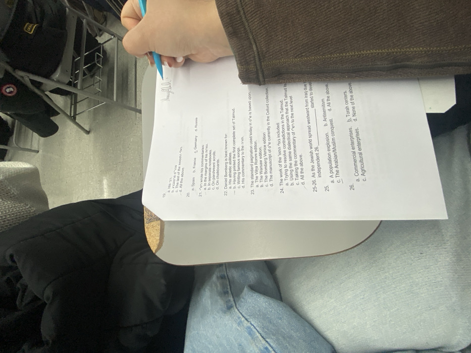 A student is taking a test with multiple-choice questions. The visible questions cover topics related to Jewish texts and history. Topics include commentaries, the Talmud, pagination of texts, and the westward spread of Jewish communities from Iraq. The student is holding a pen and appears to be working on the test. The paper rests on what appears to be a school desk, with clothing and a chair visible in the background.