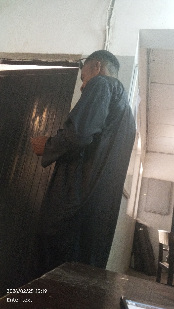 A male individual, seen from the right side, stands in an indoor setting in Dakata, Nigeria. He wears eyeglasses and a dark, long-sleeved garment. His hair is cut short. His right hand holds a small, reddish-brown, textured object. He faces towards a dark wooden door with vertical paneling, which occupies the left portion of the image. Above the door, a white ceiling with exposed white electrical conduit is visible. To the right of the individual, a light-colored wall is present. The foreground features a dark, scuffed table surface. In the background on the right, partial views of a light-colored panel, a dark fabric item, and wooden chairs are discernible. A digital timestamp "2026/02/25 13:19" is present at the bottom left.