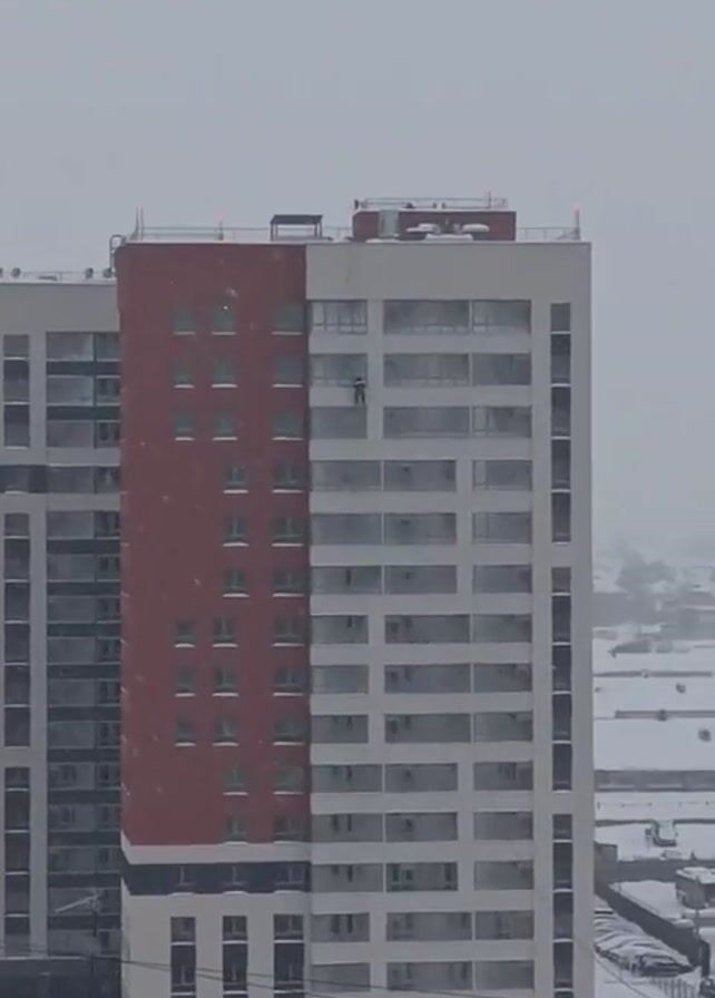 tall building in a snowy environment. The building is light in color with a red section. A person is visible outside one of the windows, seemingly working at a high level. The overall environment is gray due to the snowfall.