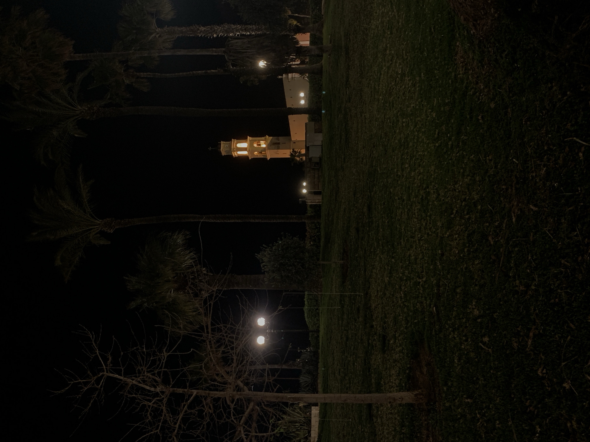 At night, a view of St. Peter's Church in Tel Aviv, Israel. The illuminated church tower stands out against the dark sky. In the foreground, a dark grassy area leads up to the church, with palm trees and a bare tree framing the scene. Streetlights provide additional illumination in the area.