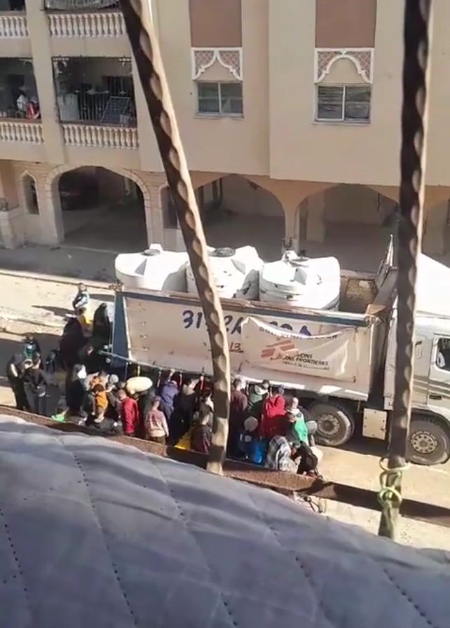 From a high vantage point, a video shows a crowded street scene. A white truck with large white water tanks in its bed is parked, and a large group of people is gathered around it. The truck has the text "DRINKING WATER" and "MEDECINS SANS FRONTIERES" printed on the side. Many of the people are filling containers with water from the truck. The people are of various ages and are wearing different clothing. The background consists of a multi-story building with arched entryways. The camera is looking through a metal railing or bars. A dark-colored cell phone lies on a patterned surface in the foreground.