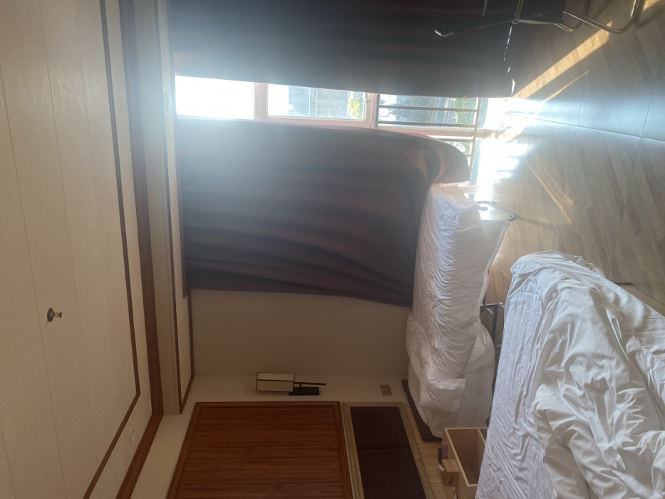 A bright room features two twin beds with white linens, one neatly made and the other rumpled. A dark curtain partially covers a window, casting shadows and light on the tiled floor. A wooden panel adorns the wall beneath the curtain, and a light fixture is visible above it. The ceiling is white with wooden trim. A chair is seen near the window, bathed in sunlight.