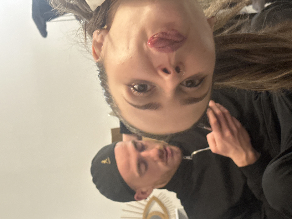 An upside-down selfie features a woman with light brown hair and a nose ring