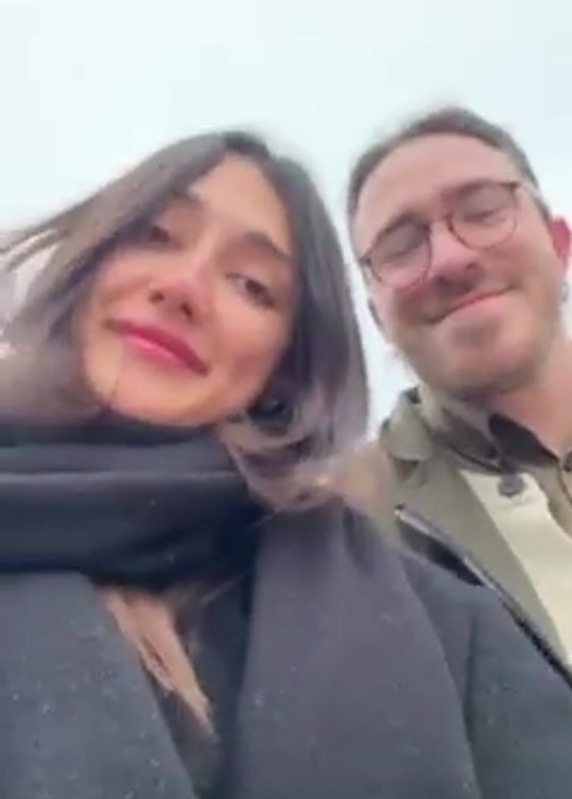 A woman wearing a black coat and a thick black scarf stands with a man outside. The woman is in the foreground and closer to the camera, while the man stands behind her, slightly out of focus. The woman looks directly at the camera and smiles. The man is also smiling and appears to be looking at the woman. The background is a nondescript, overcast sky.