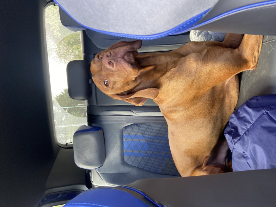 - "A reddish-brown, short-haired dog, consistent with a Vizsla breed, is seated on the rear passenger seat of a vehicle" by FM-PeREE2, licensed under CC BY 4.0