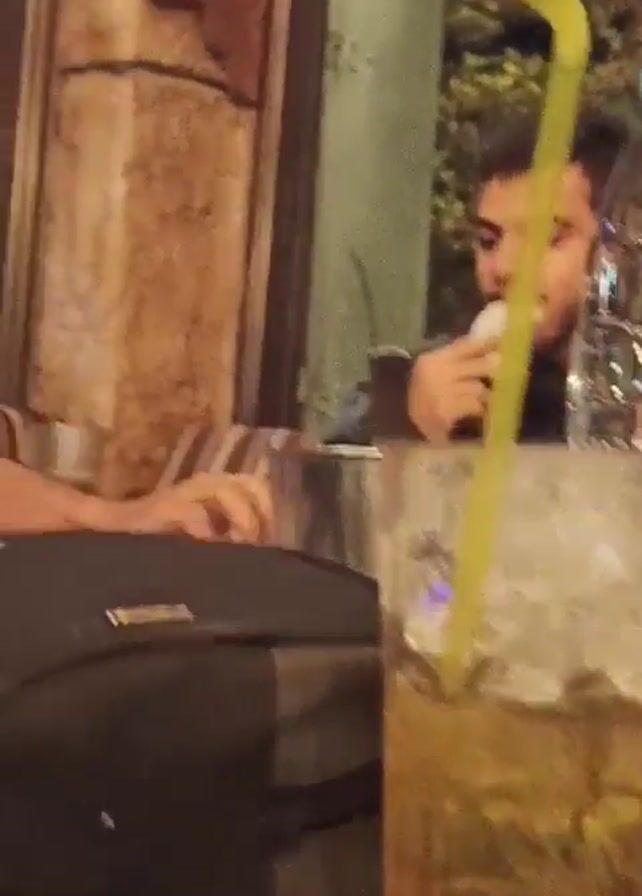 A video shows a group of young men at an outdoor cafe, sitting at a table. There is a shisha with lit coals, drinks in glasses with ice and straws, a bottle of water, and cigarette packs on the table. Some of the men are drinking and talking. The cafe has striped cushions on the seating and is surrounded by trees and plants.