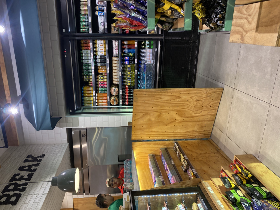 interior of a convenience store located in Callao, Peru at coordinates -12.026, -77.108. There are two men standing at a counter that is lined with various snack and candy products. One of the men is wearing a green shirt and the other is wearing a red shirt. Behind them is a large stainless steel refrigerator. On the opposite side of the counter is a large refrigerated display case filled with bottles of water, juice, and soda. To the right of the display case is a shelf filled with bags of chips. The walls of the store are white tiled and there is a sign above the counter that reads "Break". The floor is tiled in a light gray color. The store is brightly lit.