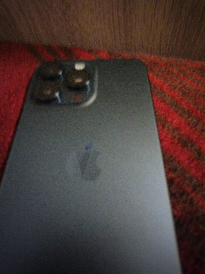 The scene is located in Birkova, Bulgaria. A dark, matte-finished smartphone, identifiable by its triple-lens camera array and a faint Apple logo on its rear panel, rests stationary on a textured surface. The device, positioned at an angle with its top-left corner towards the upper-left of the frame, occupies the central and lower-left portions of the image. The surface beneath the phone is a woven fabric, exhibiting alternating horizontal stripes of dark red and dark brown. Above this fabric, a vertically striated, brownish surface is visible, likely wood or a similar material. The image exhibits visible grain, suggesting low-light conditions, and is slightly out of focus. No individuals are present, and no actions or interactions are observed.