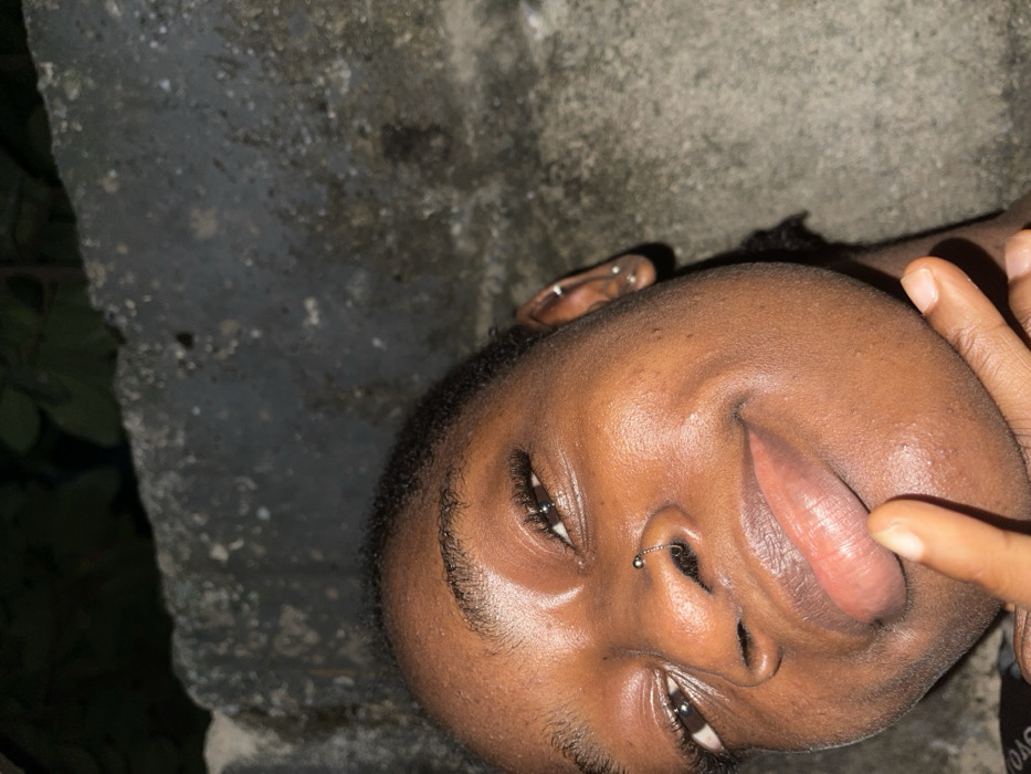 A close-up, rotated image captures a person with dark skin. They have a nose ring and several ear piercings. Their eyes are open, and their tongue is partially visible, touching their lips. One hand is partially visible near their face. The background features a rough, concrete-like surface with some dark green foliage visible on the left side.