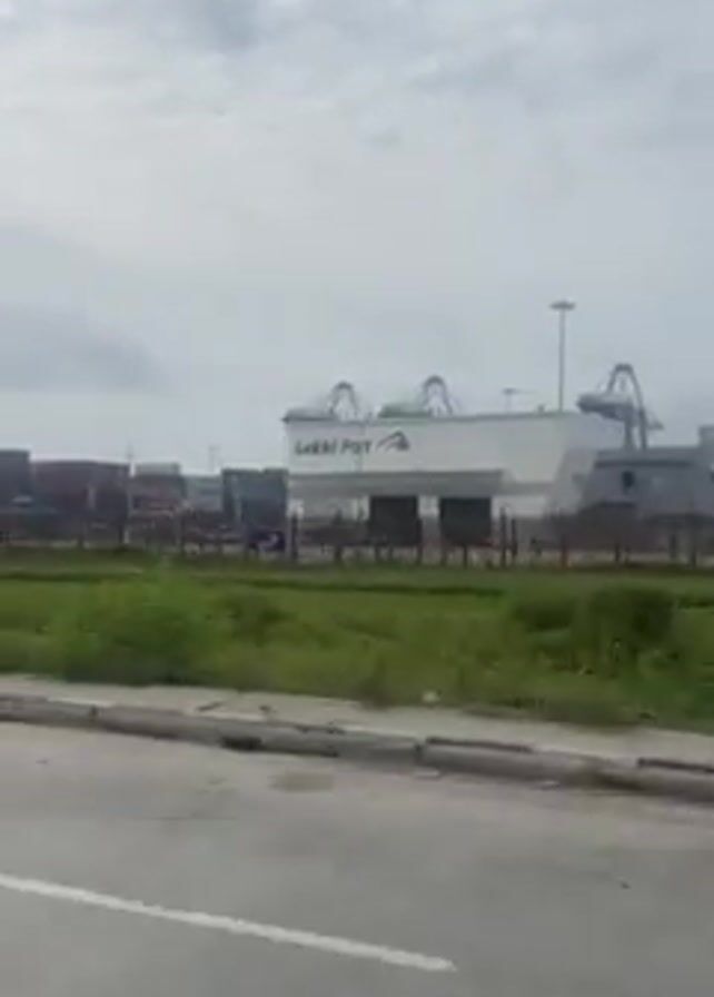view from a moving vehicle, likely a car, passing by the Lekki Port