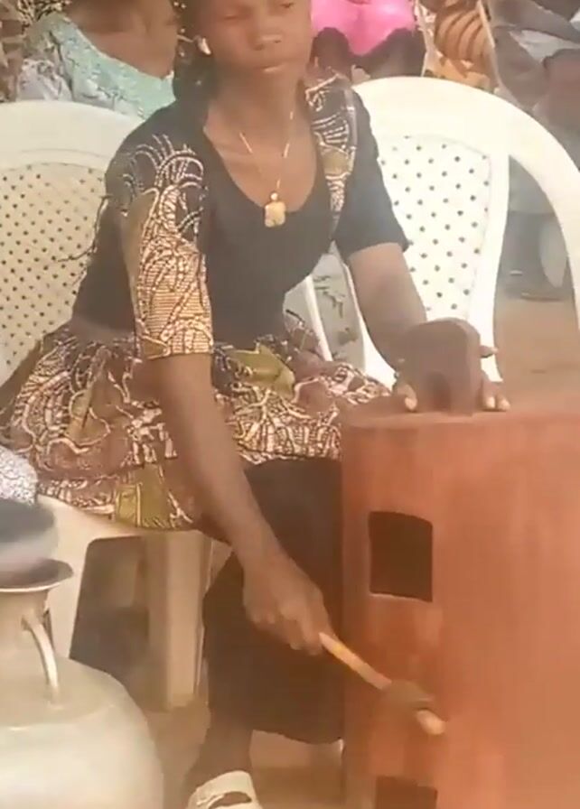 group of people, mostly women, seated and playing different musical instruments in an outdoor setting. There's a woman playing a hollow cylindrical percussion instrument with a stick. Another woman is using a paddle-like object to hit a large metal pot. A woman with an orange headwrap plays two small drums. The group is wearing traditional clothing, with patterns and vibrant colors visible. The video is taken from a mid-level angle, and the environment appears to be a gathering or performance space. The words "TECNO SPARK" are visible at the bottom.