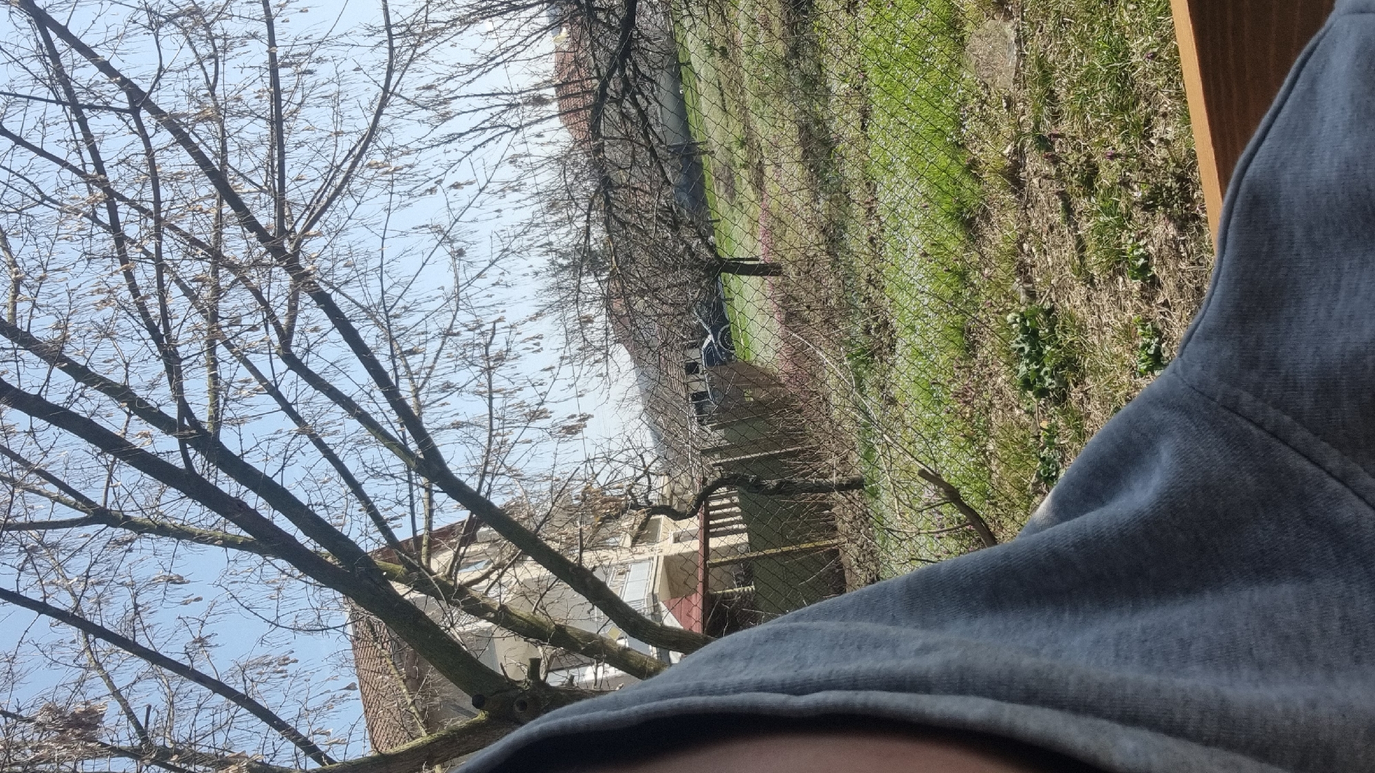 The image depicts an outdoor residential scene in Dolni Chiflik, Bulgaria, under a clear, light blue sky. In the immediate foreground, positioned in the lower-left, is the left side of an individual's upper torso and lower face, obscured by a grey hooded sweatshirt with the hood up. A dark wooden plank or railing runs along the bottom-right edge of the frame. The midground is dominated by a metal chain-link fence stretching horizontally across the width of the image. Behind this fence lies a grassy, uncultivated area with patches of green grass, exposed brown soil, and sparse vegetation, including small purple blossoms. Multiple deciduous trees with bare branches, some bearing dried seed pods or catkins, are scattered throughout this area, indicating a late winter or early spring season. On the left, behind the fence and trees, stands a two-story building featuring a light-colored facade, a reddish-brown tiled roof, and multiple balconies. A covered structure with railings extends from its lower level. Further to the right, beyond the fence and trees, two dark-colored vehicles (sedans or SUVs) are parked on unpaved ground, partially obscured. Another building with a red-tiled roof is visible in the distance on the right. No discernible actions or interactions are depicted within the scene.