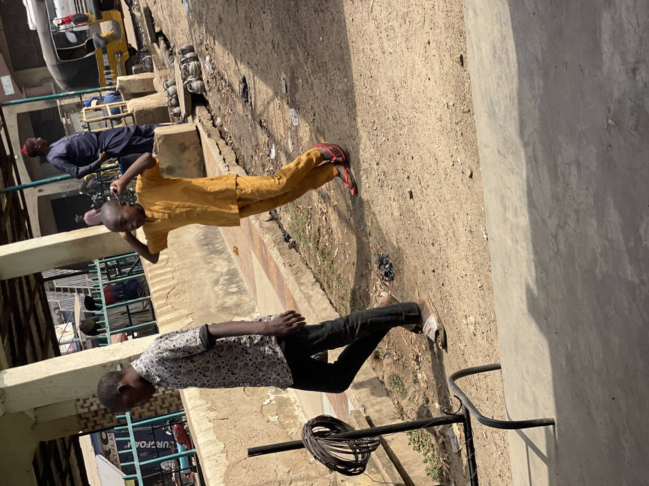 The image depicts an outdoor urban scene on a sunny day in Zaria, Nigeria, likely a street or market area. In the foreground, a young male wearing a light-colored, patterned short-sleeved shirt, dark trousers, and light-colored slide sandals walks from left to right, partially obscured by a black metal stand holding coiled black wires. To his right and slightly behind him, a younger boy in a mustard yellow long-sleeved tunic, matching trousers, and red flip-flops stands with both hands raised to his head, facing towards the right side of the frame. The ground consists of concrete in the immediate foreground, a raised concrete curb with a tiled section, and a predominant dirt path where the individuals are positioned. Further in the background on the right, an adult male in a dark blue tunic and trousers with a red cap stands, looking towards the right. Adjacent to him, a yellow and black motorized tricycle (Keke Napep) displaying "247 SSG" is parked on a dirt patch, beside which several pairs of shoes and sandals are neatly arranged on the ground. Structural elements including light-colored pillars and green railings of buildings or stalls are visible in the background. Scattered debris is present on the dirt ground. No direct interaction is observed among the individuals.