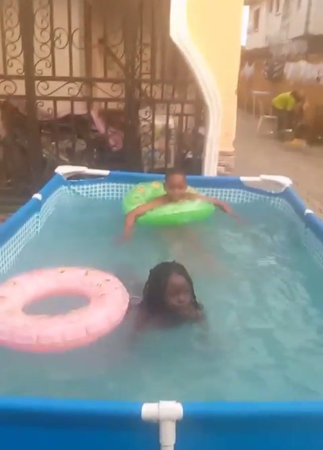 In a high-angle, slightly shaky shot, a rectangular blue pool is the primary focus, filled with clear water. Inside the pool, a young Black boy floats in a green inner tube, facing the camera and smiling. Near him, a Black woman with long hair swims in the pool, partially submerged. A pink inflatable ring floats near her. The pool is positioned outdoors, in what appears to be a backyard or courtyard. A black metal gate and the side of a yellow building are visible in the background, with various objects scattered around the yard, including furniture and other items. The overall lighting is bright, suggesting a sunny day.