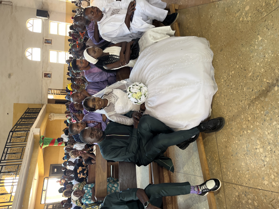 This image depicts a wedding ceremony taking place inside a large hall or church in Kuru Karama, Nigeria