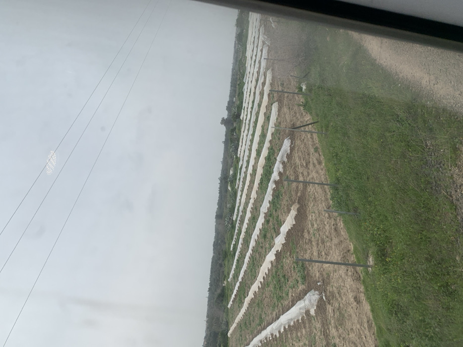 The image displays an agricultural field in Sidi Kacem, Morocco, viewed through a window, as evidenced by a partial dark frame on the right and reflections in the sky. The field contains numerous parallel rows of cultivated ground, each covered by white, translucent plastic sheeting forming low tunnel structures. These rows extend from the foreground into the midground. A strip of green grass and weeds borders the immediate foreground, separating the viewer from the cultivated land. Several dark, vertical fence posts are visible within this green strip and at the edge of the field. A narrow dirt path runs along the far right margin. In the background, a dense line of green trees and foliage marks the perimeter of the agricultural area. The sky is overcast and uniformly light gray, traversed by three parallel dark power lines. A bright, reflective circular pattern, possibly a light source or interior reflection, is visible in the upper central sky. No people or animals are present.