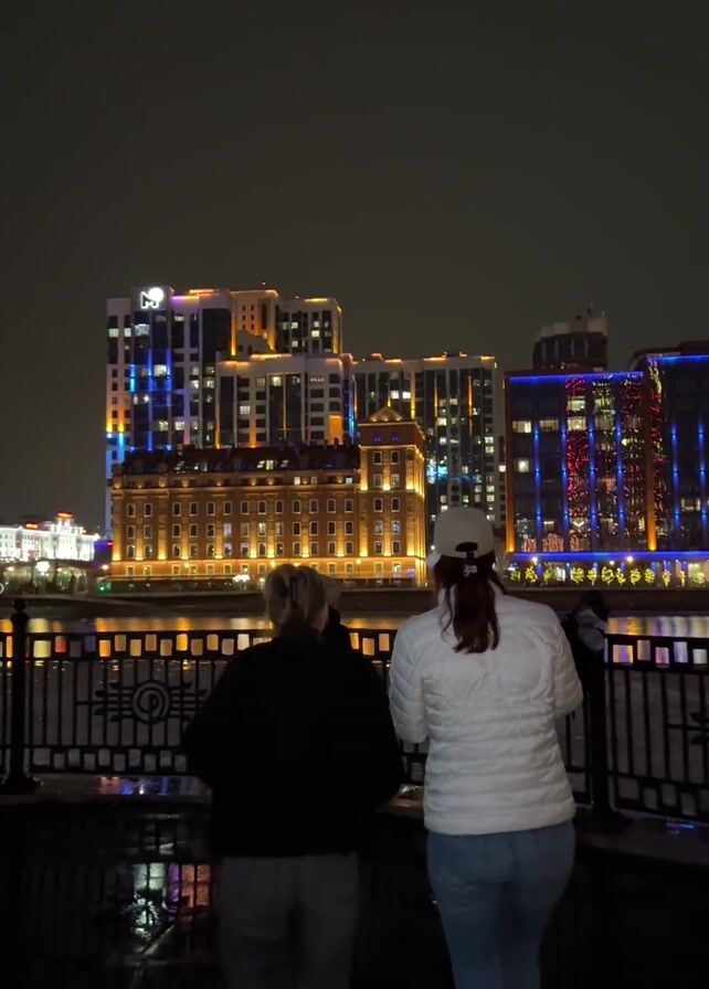 nighttime cityscape, likely in an urban area. The first shot features several people, seen from the back, standing near a railing overlooking a body of water, with illuminated buildings in the background. The video then pans quickly across a bridge with blue and green lights, before quickly shifting through blurry night scenes with light streaks and finally settling on a view of tall buildings adorned with festive red and orange lighting, alongside decorated Christmas trees and other red light fixtures. The scene appears to be wet from possible rain or snow.