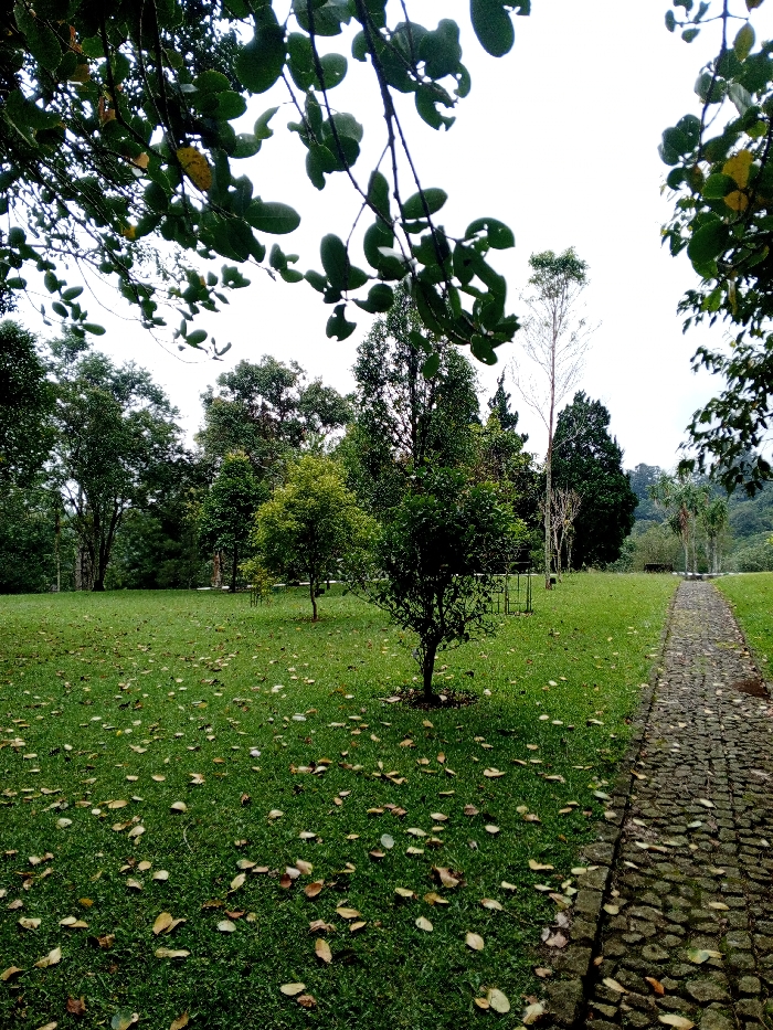 This image captures an outdoor, park-like setting within Khe Sanh Commune, Vietnam, under an overcast sky. The scene is dominated by a neatly maintained green lawn, which is extensively covered with scattered light brown and yellowish fallen leaves. A winding pathway, constructed from dark, irregularly shaped paving stones, originates from the lower right foreground and extends into the midground, curving gently to the right and disappearing from view. This path also has fallen leaves scattered upon its surface. In the midground, several small to medium-sized trees with vibrant green foliage are distributed across the lawn. A more substantial tree with a dense canopy is prominently positioned on the right side of the mid-foreground. Further into the background, a dense treeline is visible, comprising various species of trees, including some tall, slender specimens and others with broader, fuller crowns. One tall, slender tree within the treeline appears to be deciduous and largely bare or sparsely foliated. The upper portion of the frame is obscured by blurred dark green leaves and branches from an unseen overhead tree, framing the scene. The sky is uniformly light gray, indicative of an overcast condition. No individuals, animals, or additional man-made structures are identifiable within the frame.