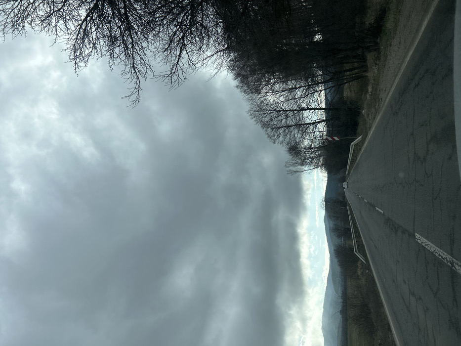 The image displays a two-lane asphalt road winding through a rural landscape in Dolno Kamartsi, Bulgaria. The road surface is heavily cracked and patched, with a solid white line bordering the right edge and a broken white line marking the center. It recedes into the distance, appearing to ascend slightly. One white sedan is visible traveling away from the viewer in the far distance on the road. To the left of the road, a metal guardrail parallels the pavement. Beyond the guardrail, an open, dry field with sparse, brown vegetation extends to the base of distant hills or mountains. These background hills are partially obscured by atmospheric conditions, with some lighter patches visible near their peaks. To the right of the road, a corresponding metal guardrail is present. Adjacent to this guardrail stands a red and white striped cylindrical hazard marker. A dense line of deciduous trees, all bare of leaves and displaying dark, intricate branch patterns, runs along the roadside, indicating a late autumn or winter season. The ground beneath these trees is covered with dry grass and sparse undergrowth. The sky is dominated by heavy, dark gray overcast clouds, with a brighter band of sky or thinner clouds visible along the distant horizon, particularly above the mountains. The overall lighting is diffuse, consistent with an overcast day. The perspective is from inside a vehicle, looking forward along the road.