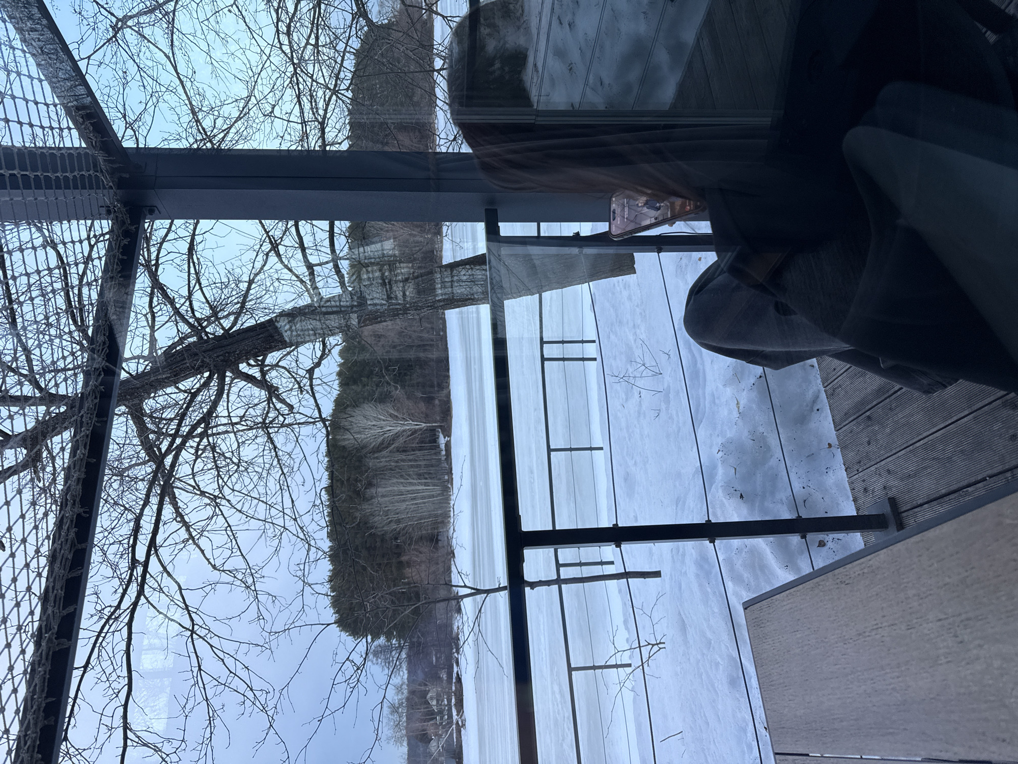 The image presents an interior view looking outwards through a large glass panel onto a winter landscape in the city of Октябрьский, Russia, specifically overlooking Kul-Kama Lake. In the immediate foreground, a light-brown wooden tabletop is partially visible on the lower left. To the right, a dark seat or chair is present, draped with a grey blanket. A distinct reflection in the glass shows the upper torso of a person with long, dark hair, holding a smartphone that displays visual content. A dark, vertical structural pillar frames the right side of the interior view, extending upwards to a frosted metal grid structure overhead. Beyond the glass, a dark metal railing system spans the view horizontally, separating the interior space from the exterior environment. The ground directly outside is covered in substantial snow, from which a thin, bare tree trunk rises. The midground features a vast expanse of frozen, snow-covered water, identified as Kul-Kama Lake. The far bank is lined with a dense forest comprising predominantly bare deciduous trees, including notable birch trees, interspersed with some darker evergreens. Distant residential structures are faintly visible through the trees on the left side of the far bank. The sky above is overcast and displays a light blue-grey hue, characteristic of a winter day.