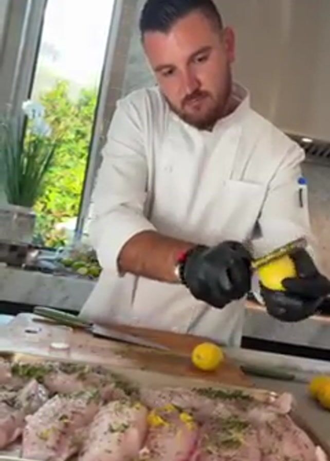 In a bright, high-end kitchen, a chef in a white coat and black gloves zests a lemon over a tray of fish fillets. The chef has dark hair, a trimmed beard, and is wearing a beaded bracelet. He smiles briefly. The fish fillets are arranged on a silver tray and appear to be seasoned with herbs and other ingredients. Next to the tray, a wooden cutting board holds a knife and additional lemons. A window in the background reveals lush greenery. The kitchen features a marble countertop and high-end appliances.