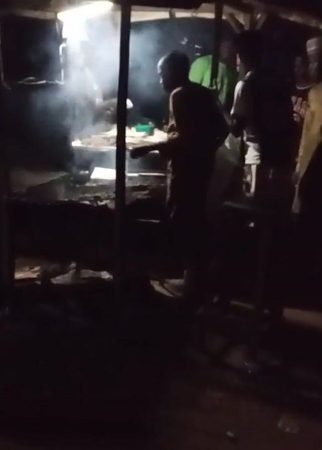 The video depicts a dimly lit outdoor food stall at night. A person stands behind the counter, seemingly cooking or preparing food on a grill. Smoke rises from the grill, partially obscuring the person's actions. Several other individuals are also present, standing near the stall, though their activities are unclear due to the low light. The stall appears to be constructed from wood, and a light source illuminates the cooking area.