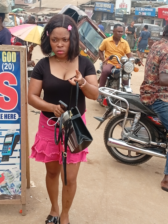 The scene is a busy street in Umuode, Nigeria, characterized by an unpaved, light brown road and commercial structures. In the foreground, an adult female with dark skin and a short, dark bob-style wig adorned with two pink hair clips on each side stands facing slightly right of the camera, looking forward with a neutral expression. She wears a black short-sleeved top with a scoop neckline, a short, layered pink ruffled skirt, and black slip-on sandals. She holds a black handbag with a striped inner lining in her left hand and a dark-colored smartphone in her right. A light-colored watch is visible on her left wrist. To her immediate left is a blue and white wooden signboard, partially visible, advertising services with text "GOD (20) S" and "E HERE," featuring images of a POS terminal and stacks of currency. In the midground, an adult male with dark skin, wearing a yellow short-sleeved polo shirt and brown trousers with black slippers, sits astride a dark-colored motorcycle with chrome accents, a round LED headlight, and a prominent exhaust pipe. He looks towards his right. Behind him and to the left of the man on the motorcycle, a dark maroon three-wheeled auto-rickshaw (keke napep) is visible, appearing to be in motion or parked with its roof slightly askew. Another male, partially visible on the far right, wears a patterned long-sleeved shirt and blue jeans. The background reveals a densely packed urban environment with one-to-two-story buildings featuring corrugated metal roofs. Visible storefronts include multiple "TECNO HOUSE" signs, "HEM ST," "CHEMIST," and "bestbet 36." Numerous other individuals are present in the background, walking or standing, suggesting a bustling market or commercial district. A pink and yellow umbrella is visible on the far left, suggesting a vendor stall.