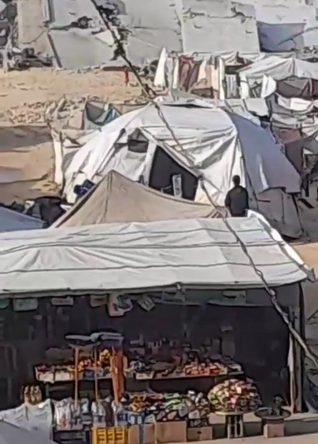 refugee camp with rows of white tents. In the foreground, there's a makeshift market stall with a variety of goods displayed. A person in dark clothing stands near one of the tents in the middle ground. Clothes are hanging out to dry in front of some of the tents. The terrain is mostly dirt and sand. In the background, more tents are visible, extending up a small hill. A tall metal structure is visible in the far background.