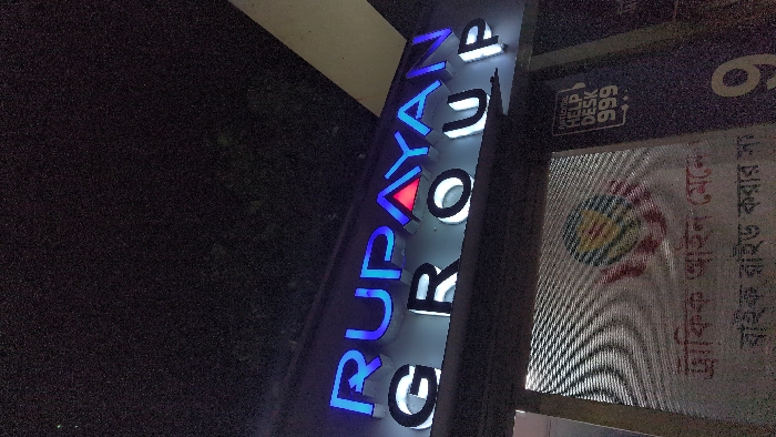 The image depicts a nighttime urban scene in Dhaka, Bangladesh, focusing on the illuminated signage of a building. Dominating the upper center is a large sign displaying "RUPAYAN GROUP." The word "RUPAYAN" is illuminated in blue, featuring a small red triangular accent within the 'A'. The word "GROUP" is illuminated in white. Below this primary signage, a reflective surface, possibly a window or a metallic banner, shows a distorted visual pattern and part of a colorful circular logo (yellow, red, green). Overlaid on this surface are Bengali characters, legible as "ট্রাফিক আইন মেনে" (Obey traffic laws) and "বাইক রাইড করার সময়" (When riding a bike). To the right of this, a vertical banner is visible, displaying "NATIONAL HELP DESK 999" with a phone icon, and a large numeral "9" partially visible beneath it. The overall environment is dark, suggesting late evening or night, with the signs providing the primary illumination. No individuals or specific actions are discernible within the frame.
