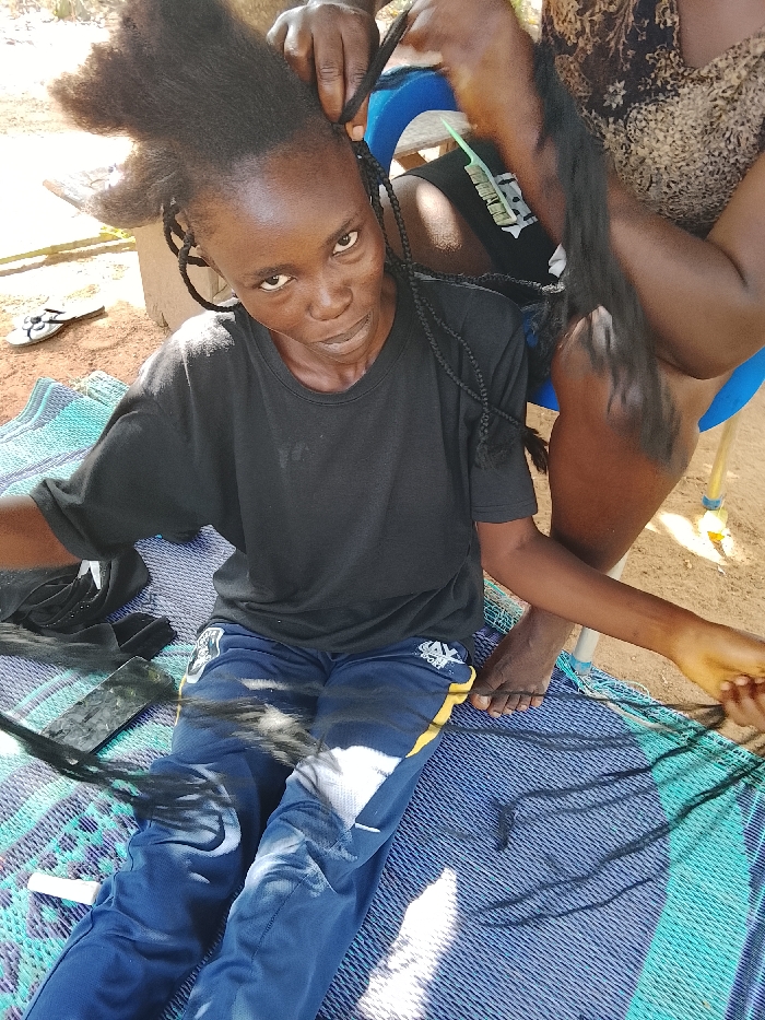 The image depicts an outdoor hair braiding session in Akwanga, Nigeria