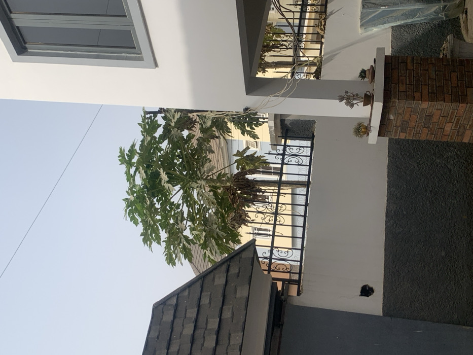 The image depicts an outdoor residential scene in Aviation Quarters, Nigeria, under a clear, pale blue sky with a single overhead wire visible. In the foreground, to the left, a section of a dark grey tiled roof with a sharp pitch is visible. Below it, a dark grey wall segment with a dark circular perforation is present. Centrally, a white perimeter wall stands, featuring a dark grey textured base and topped with a black wrought iron fence adorned with decorative scrolls and razor wire. To the right, the corner of a modern white building is visible, featuring a dark grey-framed rectangular window with dark glass on the upper floor. Below, a white support column with a reddish-brown brick-patterned base extends from the white structure. The top of this brick base serves as a display surface for three small potted decorative plants. White electrical wires are visibly routed down the side of the white building and along the white support column. A light-colored concrete pot is partially visible at the base of the column. In the midground, behind the perimeter wall and fence, a large papaya tree with green, somewhat dusty leaves occupies a prominent position. Beyond the tree and fence, parts of neighboring residential structures are visible, including a light yellow building with windows and another building with a brown tiled roof. No individuals are present or engaged in any discernible actions within the frame.