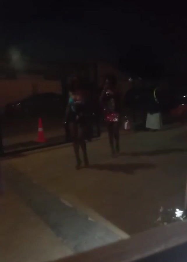 At night, the video shows two women walking in a dimly lit street or parking lot. One is wearing a blue top and a patterned skirt. The other is wearing a short, shiny dress. There are a few other people in the background, along with vehicles and an orange traffic cone. The video appears to have been taken from inside a building looking out through a window.