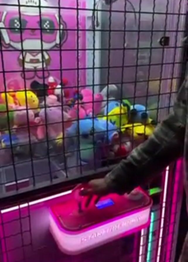 A person uses the joystick to operate a claw machine, which is lit up with pink neon lights. The claw machine is full of stuffed animals. The lower half of the machine has the words "STAR TIDE PLAY" printed on it. The machine is encased in a black wire cage.