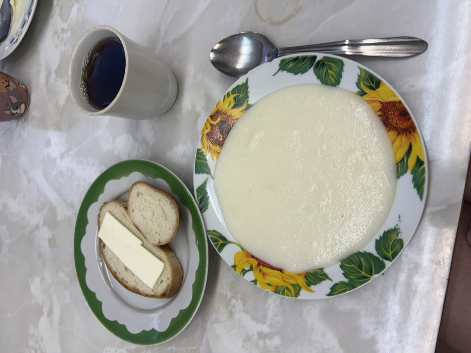 The image depicts a meal served on a light-colored, possibly marbled, tabletop surface in an indoor setting within the city of Сергино, Russia. In the foreground, a white plate with a sunflower and green leaf pattern holds a quantity of light-colored, viscous food, likely porridge or kasha. A silver-colored spoon rests to the right of this plate. Above and slightly to the left, a smaller white plate with a green scalloped rim contains two slices of bread; one slice has a rectangular slab of light yellow butter on it. To the right of the bread plate, a plain white cylindrical mug is filled with a dark liquid, consistent with tea. A portion of another vessel, possibly a cup with a patterned design featuring cartoon-like animal faces, is partially visible in the upper right background. A person's bare leg is partially visible in the bottom left corner of the frame, suggesting a first-person perspective or an individual seated at the table.