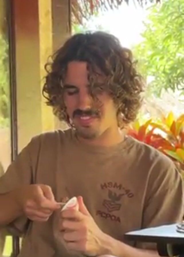 A young man with curly hair and a mustache is sitting and eating something from a small white container with a tiny spoon. He is wearing a brown t-shirt with text and a logo on it. He is sitting under a thatched roof structure, possibly on a porch or veranda, with greenery visible outside.