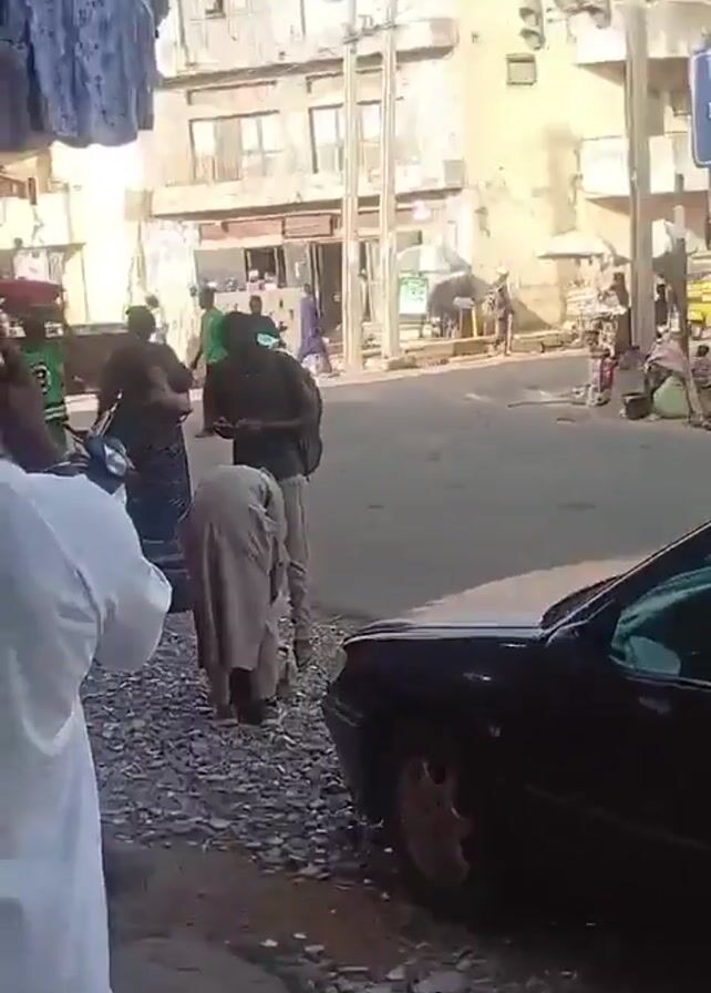 The video depicts a street scene in an urban environment during daylight. Several people are visible, including a man in a white shirt and black pants standing on the sidewalk, presumably recording the video. Across the street, people are crossing, and a yellow auto-rickshaw (tuk-tuk) is parked. One man stands looking at his phone. Another man, wearing a green Boston Bruins shirt and pants, balances a load on his head while standing on the street. A man on a white and teal scooter drives by in the street. Buildings and a Dangote Cement sign are visible in the background, with clothes hanging from a small stall on the left side of the frame. The pavement is cracked and uneven. A dark-colored car is parked on the side of the road, partially obstructing the view.