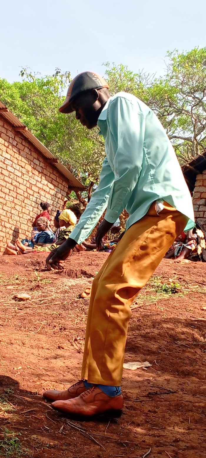 This image depicts an outdoor scene in Fizi, Democratic Republic of the Congo. In the midground, an adult male, dark-skinned, is captured bending forward at the waist, extending his right hand downwards towards the reddish-brown soil. He is attired in a two-toned cap (dark crown, lighter brim), a light blue long-sleeved button-down shirt, tan trousers, blue socks featuring a dark pattern, and brown leather lace-up dress shoes. In the background, along the left side of the frame, a reddish-brown brick wall is visible, along which several individuals, predominantly women, are seated directly on the ground. These individuals are dressed in various colorful garments and head coverings. Behind the wall and extending across the upper background are numerous green trees and bushes under a clear blue sky. The ground throughout the scene consists of dry, uneven reddish-brown dirt with sparse patches of green vegetation.