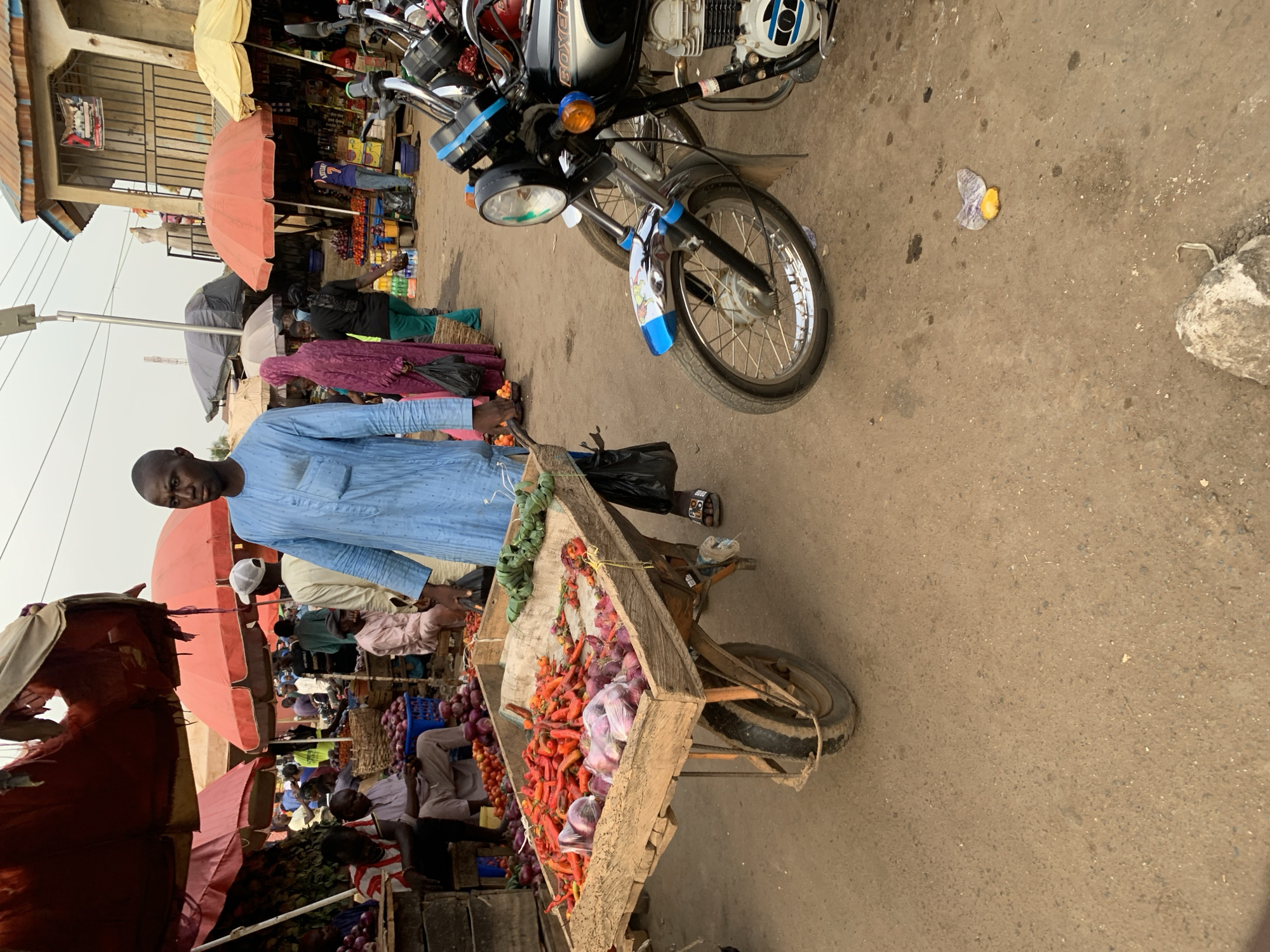 The image depicts a bustling outdoor market scene in Akwanga, Nigeria. The ground is unpaved and appears to be dirt or compacted earth. The sky is overcast. In the immediate foreground, a Black male subject, bald and wearing a light blue traditional garment and sandals, is pushing a two-wheeled wooden cart. The cart's bed contains a large pile of red chili peppers, several clear plastic bags filled with red onions, and a bundle of green leafy vegetables resting on a burlap-like fabric. The subject holds a black plastic bag in his right hand. To the right of the cart, the front section of a black and silver "BOXER" brand motorcycle is parked, displaying a round headlight, an orange turn signal, and a blue-accented front fender. Another motorcycle is partially visible behind it. On the ground, near the motorcycle, a discarded yellow item in a clear plastic bag and a grey rock are visible. In the midground, multiple individuals are present. To the left, a male subject in a white and red striped shirt sits on a wooden crate amidst piles of red onions and tomatoes. Other male subjects are seated or standing near market stalls. Further back, a female subject in a purple head covering and dress walks away from the camera, carrying a black bag. Another female subject in green pants and a black top is visible near market goods. Overhead, various market stalls are shaded by multiple large umbrellas, predominantly red, with some yellow and grey. Produce, including additional piles of red onions and tomatoes, is displayed on the ground and in baskets. The background reveals more market activity, a multi-story building with a corrugated metal roof and barred windows, and a tall street light pole. Distant figures and structures are present under the hazy sky.