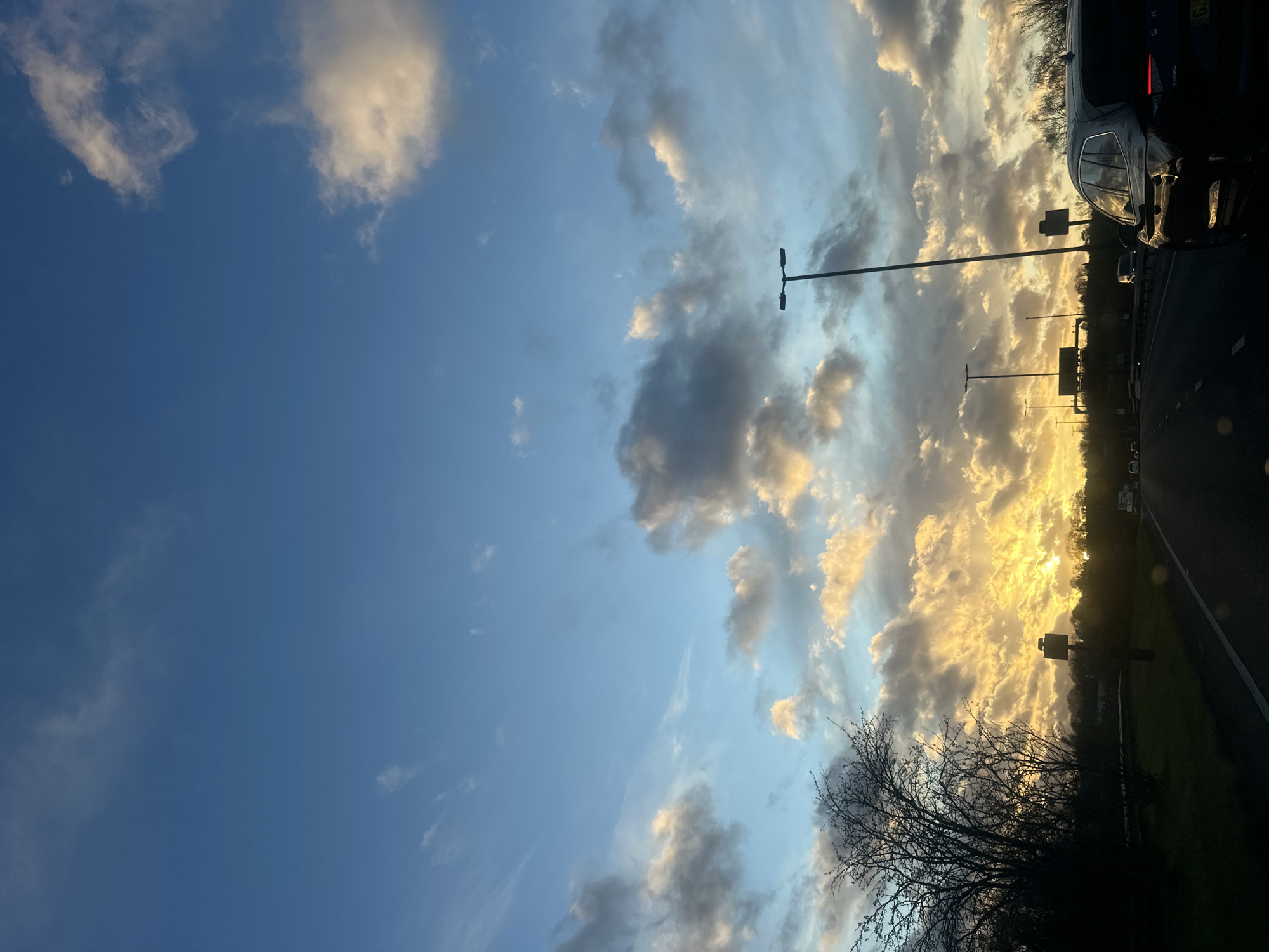 The scene is observed in Upper Upnor, United Kingdom, during the golden hour, likely sunset, under a partly cloudy sky. The upper portion of the sky is clear blue, transitioning to a mix of scattered cumulus and stratocumulus clouds below. These clouds are intensely illuminated with golden-orange light from the low sun on the horizon, while other cloud formations appear darker. A multi-lane paved road extends into the distance, marked by a solid white line on the immediate left lane's edge. In the right foreground, the rear of a dark-colored Skoda Enyaq SUV is partially visible. Multiple other vehicles appear as dark silhouettes further down the road, indicating traffic flow. Several tall, dark streetlights/lampposts and a gantry structure with potential road signs are positioned along the roadside. A roadside camera or sensor unit is mounted on a pole on the left. Deciduous trees with bare branches are prominently silhouetted against the bright horizon on the left and along the distant tree line. No individuals are distinctly visible in the frame.