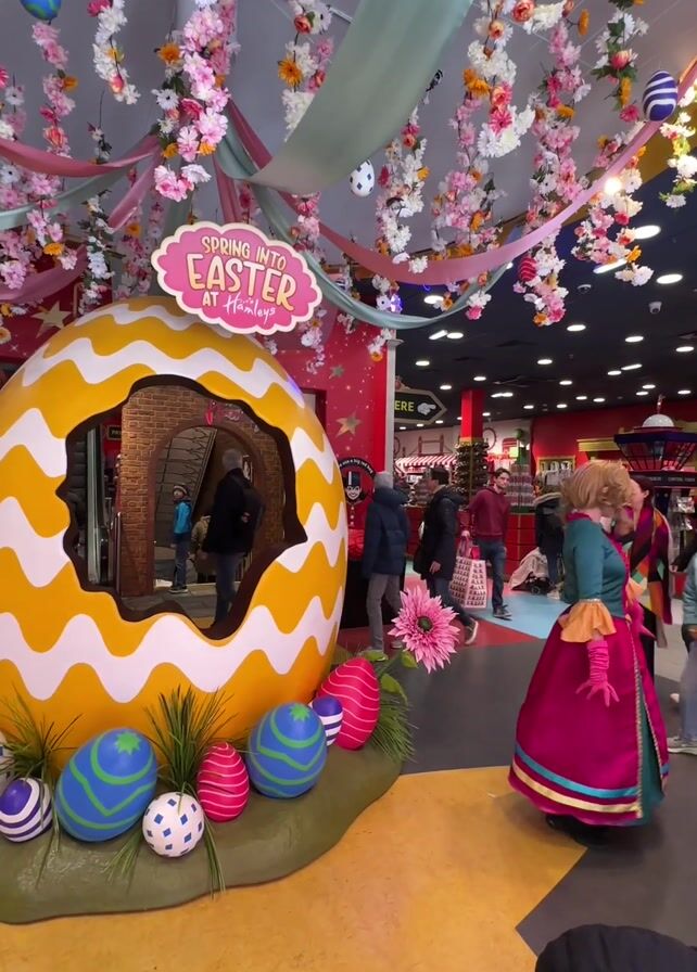 The scene takes place in a brightly decorated, crowded retail space, likely a toy store, for an Easter event. Dominating the foreground is a large, yellow and white striped Easter egg decoration with a hole in its side, serving as an entrance. A sign above reads "Spring into Easter at Hamleys." Surrounding the egg are oversized, colorful Easter eggs and a patch of artificial grass. Overhead, the ceiling is adorned with cascading floral decorations in pink, white, and yellow, interspersed with pastel ribbons. Several people are visible throughout the space. A costumed performer dressed as a princess in a pink, turquoise, and gold dress with a blonde wig is interacting with a small child. Other shoppers, dressed in casual winter clothing, are visible in the background, browsing through the merchandise. The environment is colorful and festive. In the background, store shelves are stocked with various items. Signs with arrows pointing to different areas can be seen throughout the store. The overall impression is one of a lively and child-friendly environment designed to celebrate Easter.
